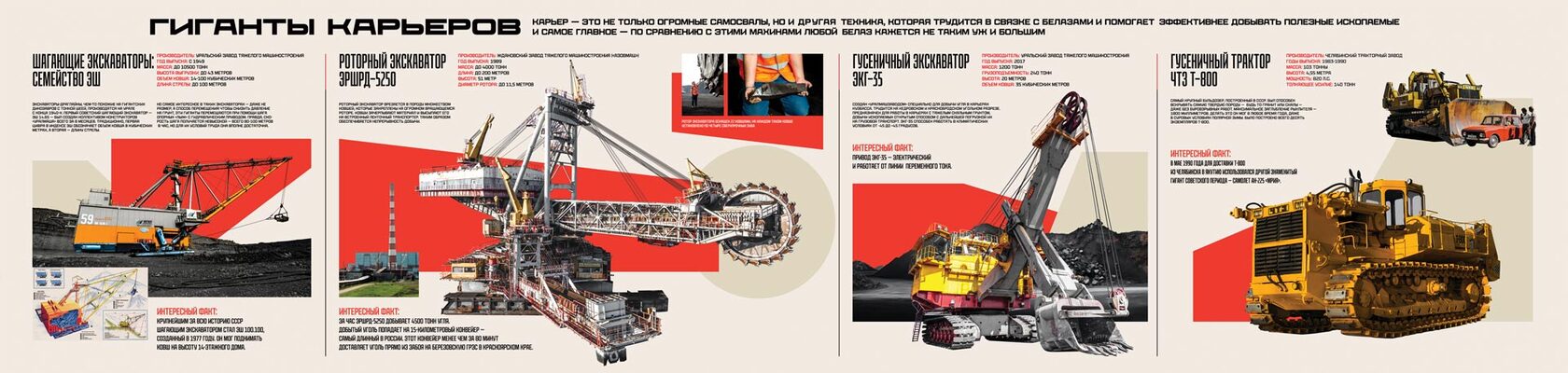 Загляните внутрь этого гиганта из Книги рекордов Гиннесса, чтобы увидеть историю карьерных самосвалов: от 4-тонного ЯС‑1 1930‑х до современных исполинов. Технику, которая поражает своими масштабами: от шагающих экскаваторов до уральского великана ЭКГ‑35.